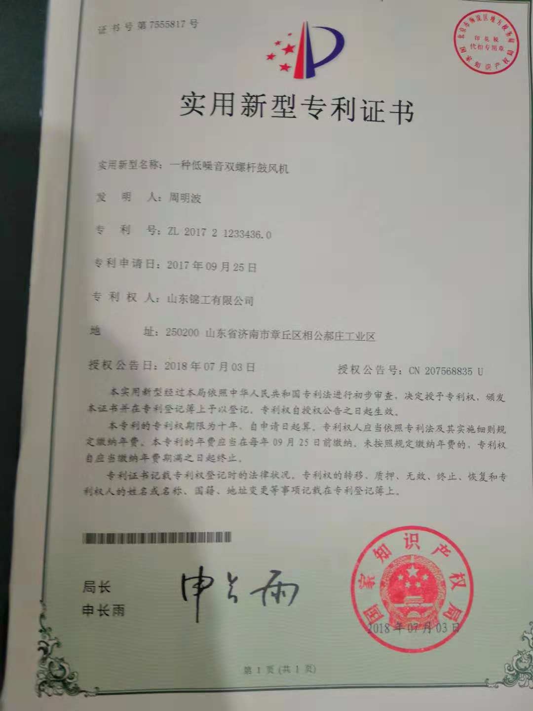 日前,錦工風機的“一種雙螺桿鼓風機” 、“一種緊湊型羅茨鼓風機” 、 “羅茨風機選型軟件” 等獲國家知識產(chǎn)權(quán)局頒發(fā)的專利及軟著證書。