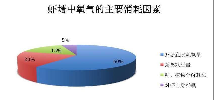 水體種溶解氧的消耗,絕大部分是水呼吸,也就是水體中各種微生物、有機(jī)質(zhì)等的消耗;其次是水體中水生植物、浮游生物、底棲動(dòng)物等消耗;然后是養(yǎng)殖動(dòng)物的消耗。養(yǎng)殖動(dòng)物消耗的溶解氧量是最小的,只有整個(gè)池塘耗氧量的百分之五左右。我們看一下錦工一位做養(yǎng)殖對(duì)蝦的客戶蝦塘的氧氣消耗因素。