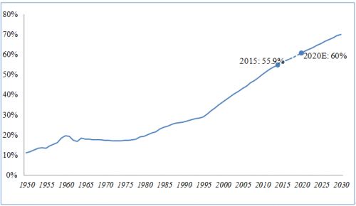 從世界發展情況看,城市化率的發展在超過了30%以后就進入了高速發展期,全世界都這樣。